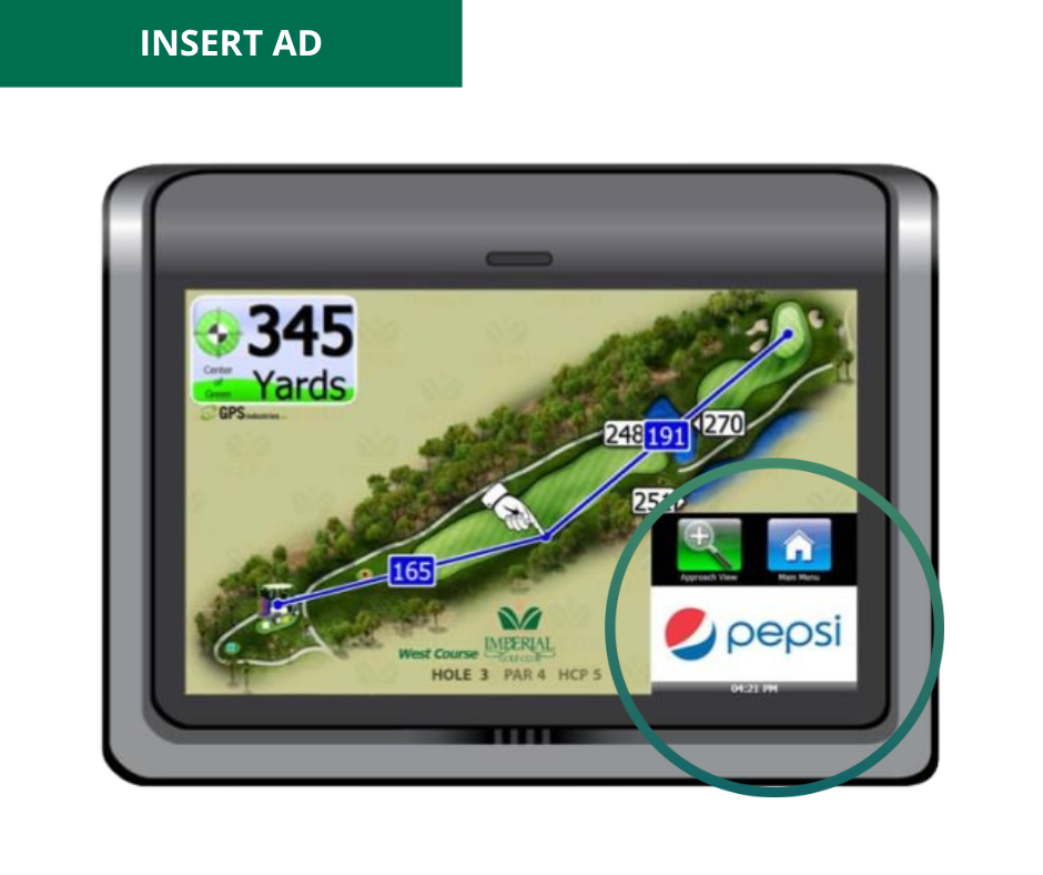 - Insert Ads: Insert ads display consistently for the entire location specified: Green, Tee, and/or Fairway. The ad is displayed in the lower right or left hand corner depending on hole layout.